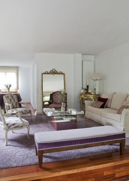 El salón puede presumir de ser una estancia muy luminosa gracias a la presencia de dos grandes ventanales y a una decoración en tonos claros y malvas que ayuda a proyectar la luz.