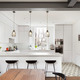 Detalle de iluminación de subida a escalera con empotrados en pared y tubos colgantes, aportando más si cabe luminosidad y sencillez a la estancia