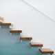 Detalle de la escalera volada , dando la sensación de escalera suspendida sin tabicas.